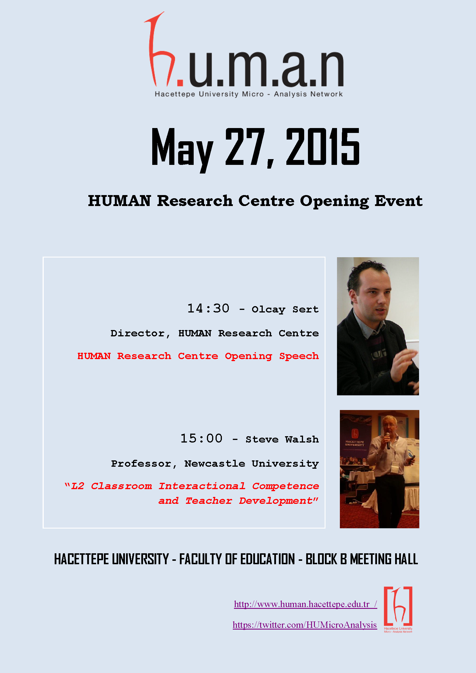 We are happy to announce that Prof Dr Steve Walsh will deliver an invited talk entitled “L2 Classroom Interactional Competence and Teacher Development” on the 27th of May, Wednesday at Hacettepe University, Beytepe Campus. Please see the poster below for details on the venue. The event is hosted by HUMAN (Hacettepe University Micro Analysis Network) Research Centre. We look forward to seeing you in Beytepe on Wednesday.