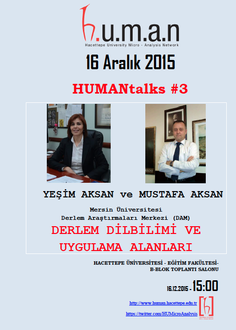 HUMAN (Hacettepe University Micro Analysis Network) HUMANtalks serisinin üçüncüsünde Mersin Üniversitesi öğretim üyeleri ve Derlem Araştırma Merkezi’nin (DAM) kurucuları Prof. Dr. Yeşim Aksan ve Prof. Dr. Mustafa Aksan’ı konuk edeceğiz.