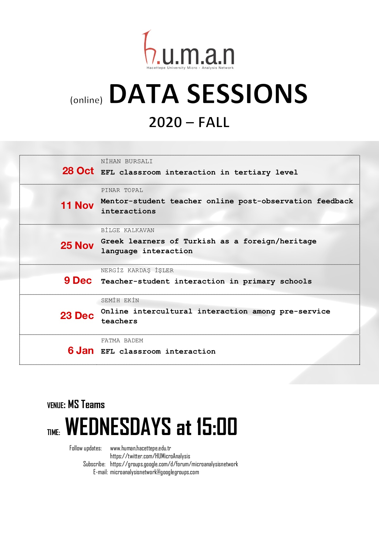 In our next data session, Fatma Badem Korkmaz (Hacettepe University) will present an extract from her corpus of online EFL classroom interaction. The session will be held online and start at 15:00, December 23.