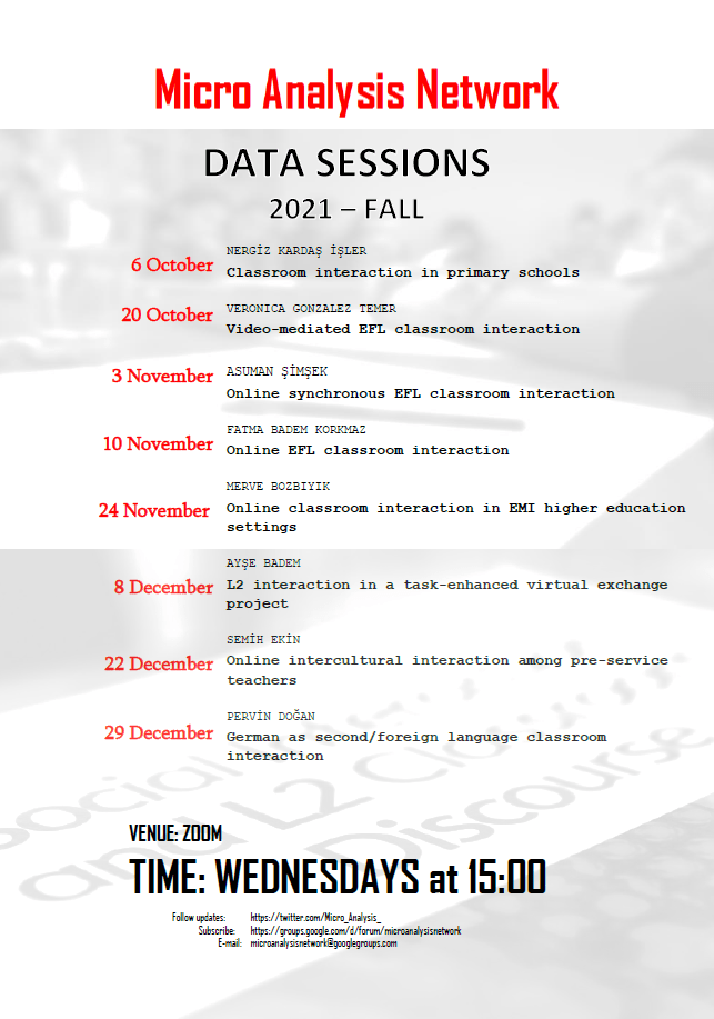 In our next data session, Veronica Gonzalez Temer (Universidad Metropolitana de Ciencias de la Educación) will present an extract from her corpus of video-mediated EFL classroom interaction. The session will be held online via Zoom and start at 15:00, October 20.