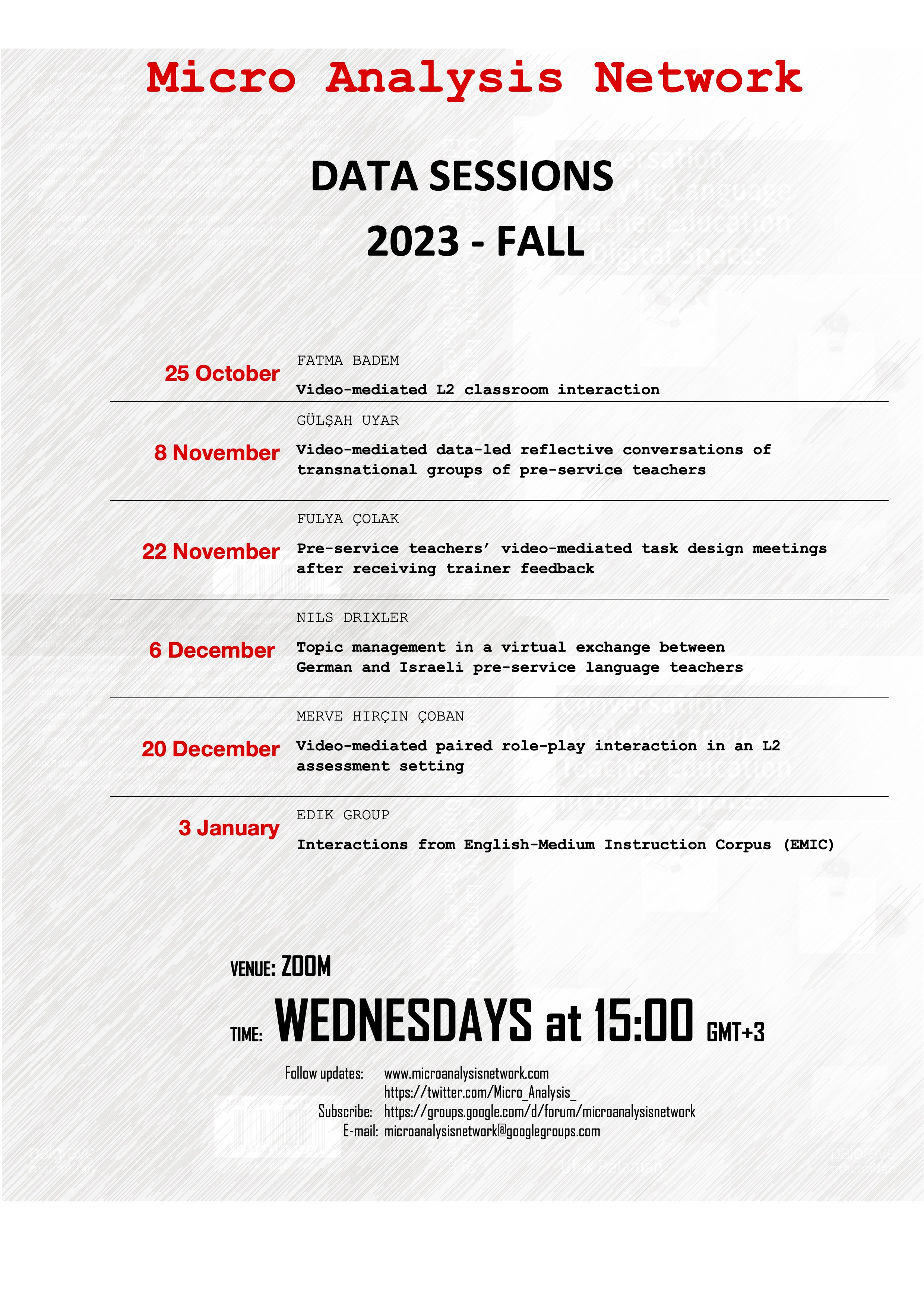 In our next data session, Merve Hırçın Çoban (PhD student and instructor at METU) will present an extract from her corpus of video-mediated paired role-play interaction in an L2 assessment setting. The session will be held online via Zoom, starting at 15:00 (GMT+3), December 20.