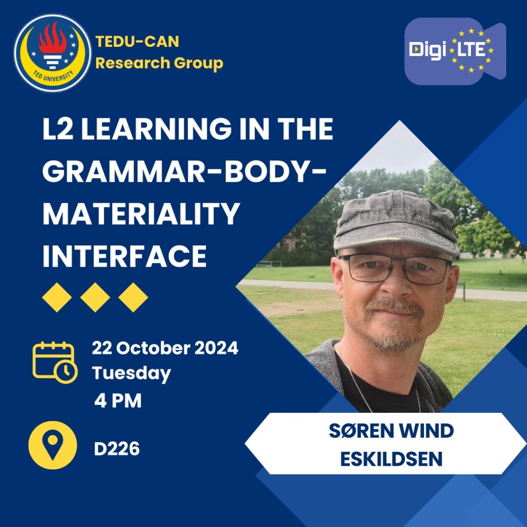 In the next TED University Conversation Analysis Research Group seminar, Søren Eskildsen will deliver a talk entitled “L2 Learning in the Grammar-Body-Materiality Interface”. The seminar is sponsored by the DigiLTE project and part of the forthcoming Transnational Meeting of the DigiLTE project (23-25 October, 2024). Dr. Eskildsen will participate in the meeting after the TEDU-CAN seminar as an invited expert/external advisor and bring new insights into the project activities with his expertise in L2 interaction research.