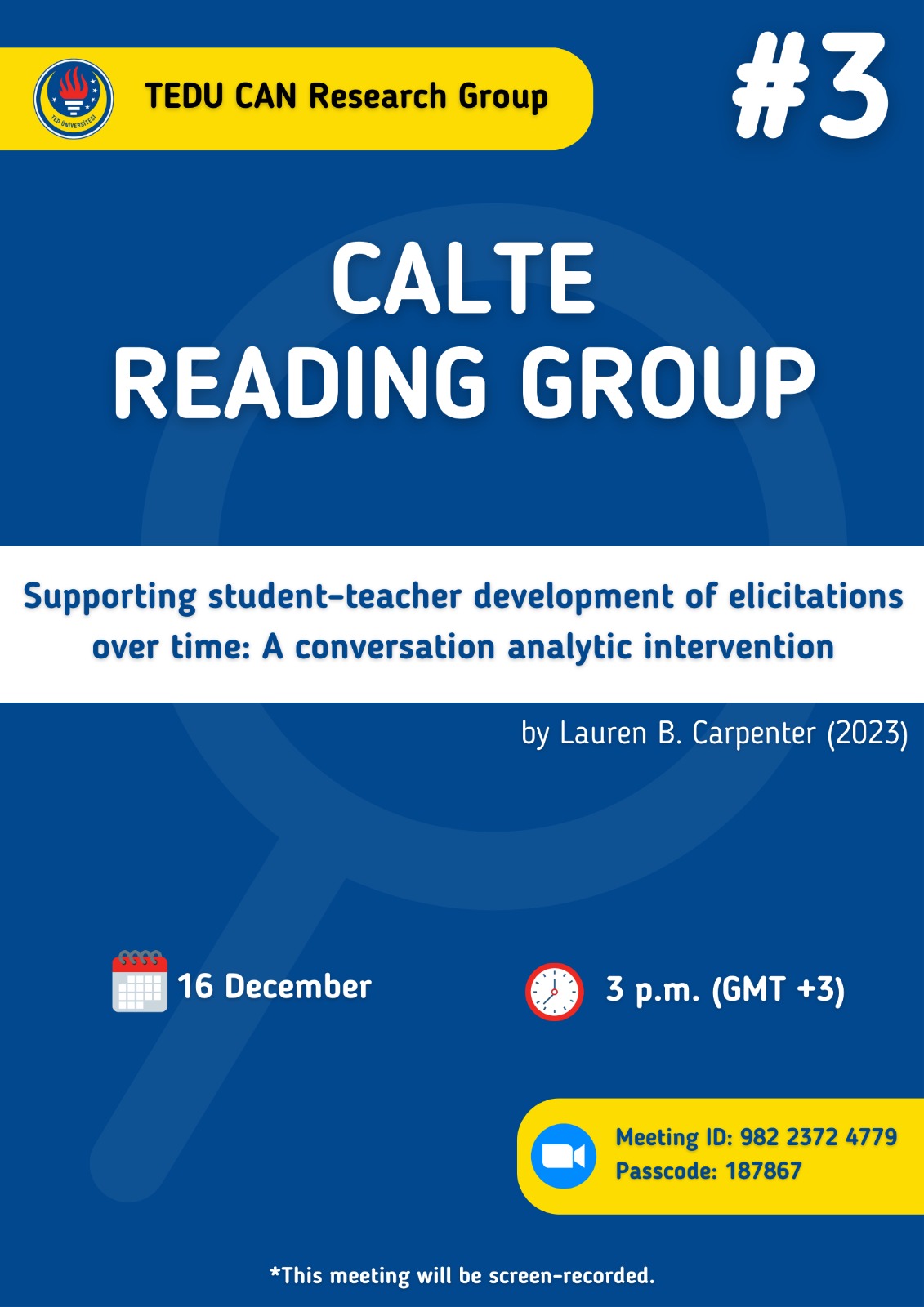 The third CALTE reading group meeting is inbound! Next in our readings, we will be looking into “Supporting student–teacher development of elicitations over time: A conversation analytic intervention” by Lauren B. Carpenter. You can find the paper here.